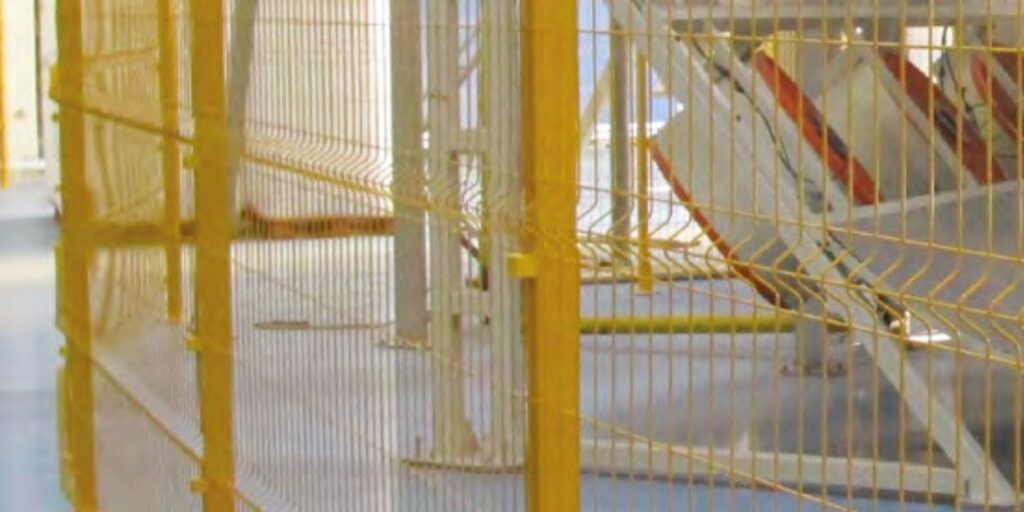 Soluções de segurança NR12, com postes galvanizados e revestidos em pintura eletrostática. Arame de 4mm, malhas de 7,50x20cm, largura de 1,50 a 2,50m. Controle de acesso, instalação modular, espaçamento ajustável.