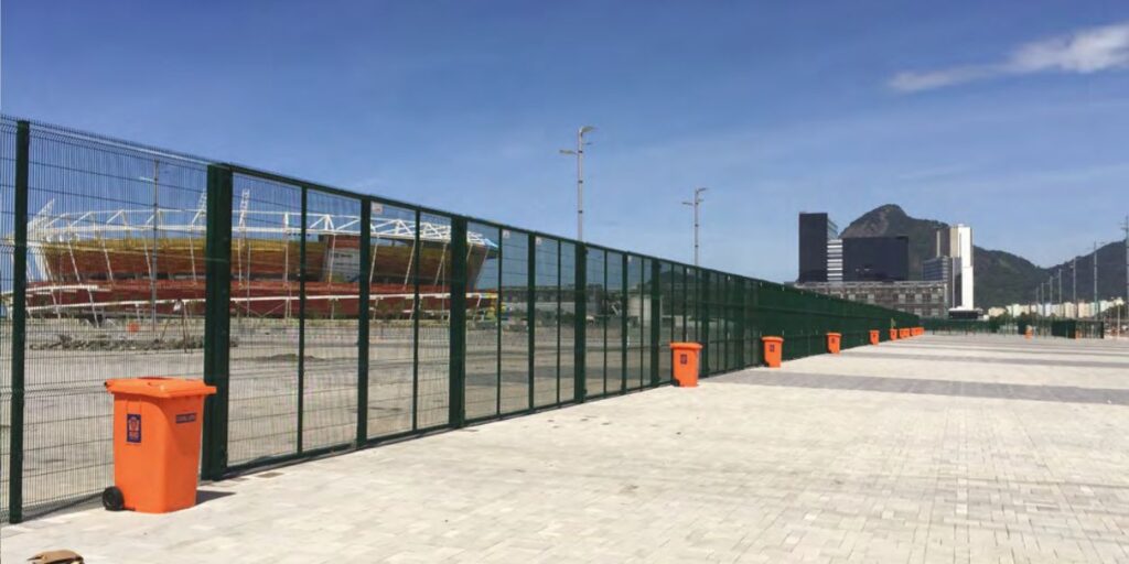 Gradil eletro-soldado fabricado com arame de aço O Gradil e os postes foram de acordo com a especificação do COI - Comitê Olímpico Internacional. Como melhor solução apresentada para proteção e segurança, o Gradil Exclusive reforça o reconhecimento de nossos produtos e comprova a qualidade de toda nossa linha. Foram no total 8.000 metros de cercamento em Gradis, com mais de 300 portões instalados, e 01 ano de trabalho na instalação entre 2015 e 2016.imersão a quente, com até 70gr de zinco.